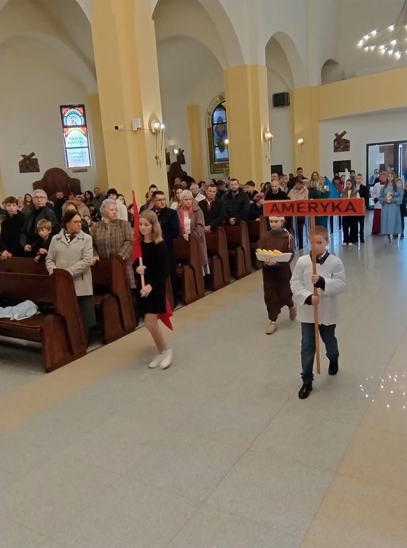 22 października 2023 roku przeżywaliśmy w Kościele Niedzielę Misyjną, która rozpoczyna Tydzień Misyjny. Jest to czas żarliwej modlitwy w intencji misji i misjonarzy. W naszej parafii co roku w tym dniu staramy się przybliżać wiernym tematykę misyjną. Dzięki zaangażowaniu dzieci ze Szkoły Podstawowej w Żółtańcach oraz kreatywnym pomysłom wikariusza i katechety ks. Grzegorza Jarmosza udało nam się to uczynić także i tym razem. Podczas Mszy świętej o godz. 12.00 miała miejsce procesja misyjna. Dzieci przebrane za przedstawicieli poszczególnych kontynentów niosły dary, a kolorowe flagi i banery z nazwami poszczególnych rejonów świata przyczyniły się do barwnej oprawy. Na zakończenie Eucharystii odbyła się inscenizacja misyjna. Mali aktorzy zaprezentowali charakterystykę kontynentów, wskazali problemy i trudności, z którymi się zmagają ich mieszkańcy oraz zachęcali do modlitwy za poszczególne rejony świata.