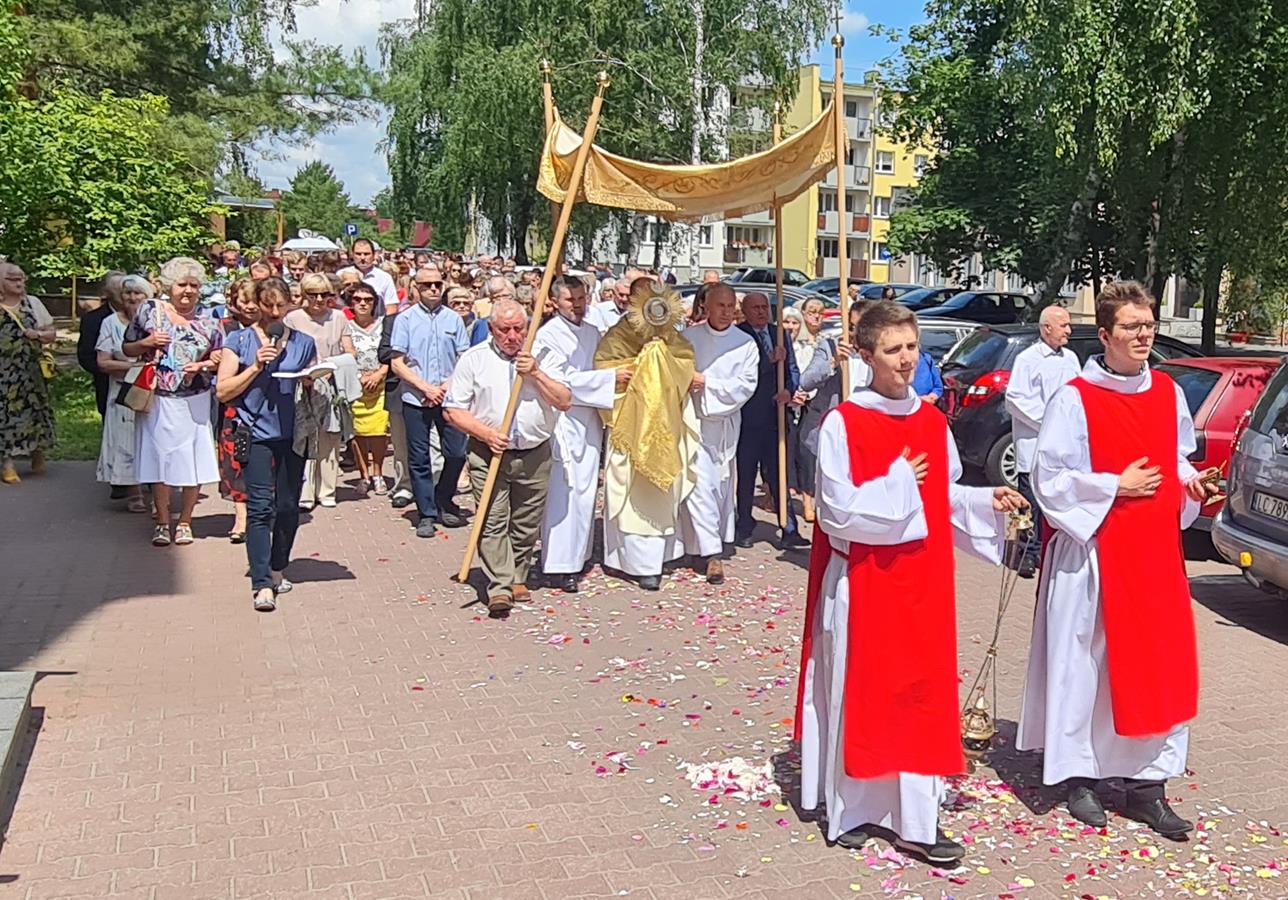 W naszej parafii tego dnia uroczysta Msza święta miała miejsce o godz. 10.30. Po niej wyszliśmy w procesji eucharystycznej na osiedle „Słoneczne”. Przeszliśmy przez środek osiedla, zatrzymując się przy czterech ołtarzach, przygotowanych przez naszych parafian. Przy każdym ołtarzu odczytywane były fragmenty Ewangelii mówiące o Eucharystii. Ponadto w przebieg procesji zaangażowało się wielu naszych parafian. Warto wymienić: dziewczynki sypiące kwiaty, chłopców niosących różaniec, Liturgiczną Służbę Ołtarza, członków grup duszpasterskich takich jak Legion Maryi, Róże Różańcowe czy Domowy Kościół, którzy nieśli różnorodne symbole naszej wiary.