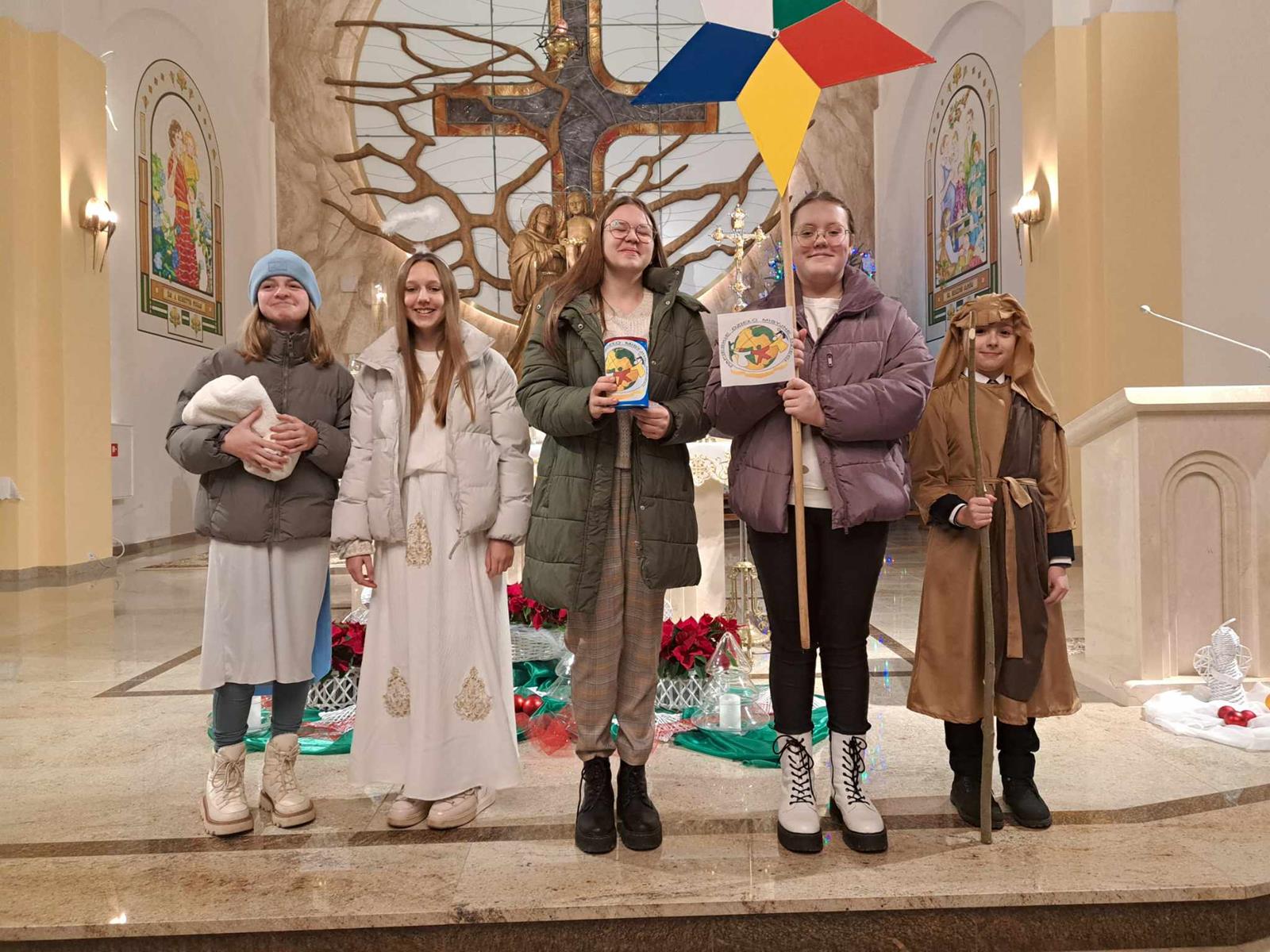 Kolędnicy Misyjni to akcja podejmowana przez Papieskie Dzieło Misyjne Dzieci. Ma ona na celu przybliżenie ludziom, że narodził się Jezus Chrystus. Ponadto jest okazją, aby opowiedzieć o codziennym życiu dzieci w różnych rejonach świata. Jednocześnie staje się jedną z form ewangelizacji oraz daje możliwość niesienia pomocy dzieciom z krajów misyjnych. W tym roku ofiary zebrane przez Kolędników Misyjnych są przeznaczone dla dzieci z Kolumbii. Dzieci z naszej parafii, a zarazem uczniowie Szkoły Podstawowej w Żółtańcach, regularnie od kilku już lat angażują się w to dzieło. 1 stycznia 2024 roku trzy grupy kolędnicze o godz. 14.00 wyruszyły z naszego kościoła, aby odwiedzić mieszkańców parafii w blokach na osiedlu słonecznym. W każdym mieszkaniu, gdzie zostali przyjęci, zaprezentowali krótką scenkę nawiązującą do Bożego Narodzenia i tematyki misyjnej. Całość przedsięwzięcia została przygotowana przez wikariusza, ks. Grzegorza Jarmosza oraz rodziców, którzy zatroszczyli się o stroje dla dzieci i pełnili rolę opiekunów grup kolędniczych.